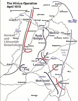 Piłsudski arrived at the front near Lida on 15 April, bringing reinforcements from Warsaw. His plan called for exploitation of the gap in the Soviet lines between Vilnius and Lida by an advance towards Vilnius using the road and railway. Amidst diversionary attacks, designed to draw Russian attention away from the main Polish thrust towards Vilnius, the main Polish attack began at dawn on 16 April.[2] The forces moving on Vilnius included the cavalry group of Colonel Wladyslaw Belina-Prazmowski, composed of 800 men in nine cavalry squadrons and a battery of horse artillery; and infantry under General Edward Rydz-Śmigły with 2,500 men in three battalions of the Polish 1st Legions Infantry Division and two batteries of heavy artillery.[2]