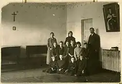 A group of students at the school sometime between 1921 and 1930. Portrait of Grand Duke Vytautas hangs on the wall.