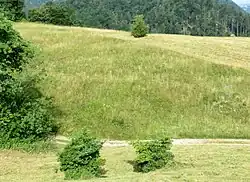 Vincarje is the site of two known mass graves from the period immediately after the Second World War. They are part of the mass graves associated with the nearby former Loka Castle prison. The Castle Wall 1 Mass Grave (Slovene: Grobišče pri grajskem obzidju 1) is located in a meadow on a slope about 30 meters (98 ft) outside the wall of Loka Castle. It contains the remains of an unknown number of Home Guard prisoners of war and Slovene civilians, and possibly victims of other nationalities.[5] The Bear Valley Mass Grave (Grobišče v Medvedovi dolini), also known as the Ski Valley Mass Grave (Grobišče Smučarska dolina), lies in the Bear Valley Sinkhole (Medvedova dolina), about 500 meters (1,600 ft) southwest of Loka Castle and 200 meters (660 ft) east of the castle wall. It contains the remains of 20 German prisoners of war that died or were murdered in the summer of 1945. The remains may have been exhumed.[6]