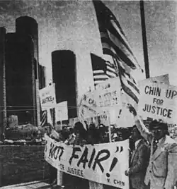 The lenient sentencing of Ebens and Nitz enraged the Asian-American communities in the Detroit area and across the United States, who saw it as a sign of public indifference toward racism directed at Asian-Americans.[8] The president of the Detroit Chinese Welfare Council said the verdict amounted to a "$3,000 license to kill" Chinese Americans.[10] Others across the country were spurred into activism; the advocacy group American Citizens for Justice (ACJ) was formed to protest the sentencing[9] and began working toward a judicial appeal.[8] The ACJ quickly gained the support of diverse ethnic and religious groups, advocacy organizations, and politicians such as the Detroit City Council president and Congressman John Conyers.[29]