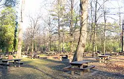 The park has wooded walking paths, rolling meadows, scenic vistas, open grassy areas for playing sports, and picnic tables. Available amenities include washrooms, pathways, water fountains, bandstand, two softball diamonds, electrical hook-ups, and barbecue pits.[1]