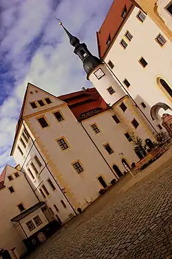 On 22 June 1943 Eichstätt tunneller Jack Champ arrived at Oflag IV-C (Colditz).[14] Reinhold Eggers and his security staff processed Champ the following day. A protocol required a photograph of Champ with his prison number. In the Schloss, a guard had to chaperone a civilian worker, at all times. Inmates goon baited the protocol. Three water bombs from the third and fourth floors hit the cobbled floor. Splashes soaked Champ, his comrades and the civilian cameraman.[15] This angered the guard and cameraman, who rushed up the staircase, seeking to arrest those responsible on the third and fourth floors.