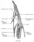 ![]() Tendons of forefinger and vincula tendina. (Vincula brevia labeled at lower left; vincula longa labeled at bottom center.) | |