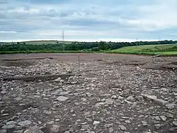 Not much is yet known about pre-Roman settlement in the immediate area. The fort was probably established around AD 79 to guard the crossing of the River Wear by Dere Street, the main Roman road between York, Hadrian's Wall and Scotland, and also the fort's main street (via principalis). Sitting atop a hill 15 metres (49 ft) above the Wear, Binchester was the largest Roman fort in County Durham.[3] The land was cleared of trees and brush and a huge levelling fill laid down on the plateau before construction of the fort began. Archaeologists found four coins of Vespasian that seem to corroborate that initial building was related to Agricola's march northward into the territory of the Brigantes.[4] Two phases of timber structures, most likely barrack blocks, were constructed atop the levelling deposit. Much later, perhaps centuries later, buildings inside the fort were levelled and reconstructed in stone. These included a commandant's house at the heart of the fort and a well-appointed baths building, both of which went through several phases of development (see below under the archaeological history).