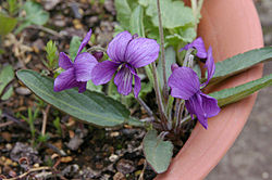 As a violet, its trumpet-shaped flowers have five petals and bilateral symmetry. The lowermost petal is often the smallest, and all petals are typically a rich purple hue, though this can vary due to local conditions or localized mutations, and in some varieties deliberately bred for differing appearance. It blooms from April to May and the fruiting period is from May to September.[3][4]