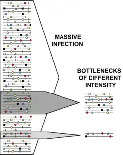 - ^ Gutiérrez S, Michalakis Y, Blanc S (October 2012). "Virus population bottlenecks during within-host progression and host-to-host transmission". Current Opinion in Virology. 2 (5): 546–55. doi:10.1016/j.coviro.2012.08.001. PMID 22921636.