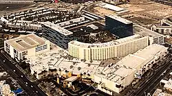 Virgin Hotels Las Vegas has a modern design with a desert oasis theme.[15][16][17] The design phase was underway in June 2018.[10] Renovation work was originally scheduled to begin and end in 2019, but the amount of work was increased as additional improvements were deemed necessary. During the first year of ownership, Bosworth and the other owners observed how the Hard Rock operated, which helped them in their renovation plans. The design changes increased the cost of renovations from $150 million to $200 million. In April 2019, it was announced that the renovation project would now begin in February 2020,[18][19] with a grand opening celebration at the end of the year.[20] Design work was nearly finished at the time of the announcement. The design team included Klai Juba Wald Architecture + Interiors, Rockwell Group, and Studio Collective. McCarthy Building Companies and Taylor International Corporation were selected as the general contractors.[18][21]