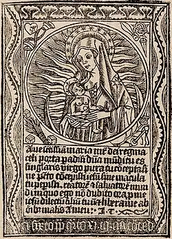 The prayer, which was immensely popular in the Middle Ages, refers to the Immaculate Conception of the Virgin Mary i.e. to say not the doctrine of the Virgin Birth but rather that Mary herself was conceived free of original sin (hence the yourself conceived without sin of the prayer), a doctrine made popular by Pope Sixtus IV who was said to have granted an indulgence of 11,000 years to anyone who recited the prayer before an image of the Virgo in Sole.[9][10]