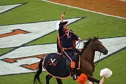 The team's eponymous mascot, known informally as the Cav Man, is a fanciful depiction of a swashbuckling Virginia Cavalier as popularized in the Cavalier fiction of the Antebellum South, armed with a sword and dressed in an orange and navy cloak and plumed hat.[16]
