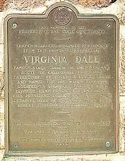 In 1865 future Vice President Schuyler Colfax (then Speaker of the US House of Representatives) was detained at the post by Native American raids. It is possible that Virginia Dale served briefly as a telegraph station.