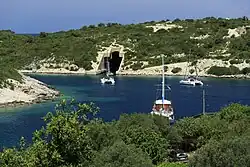 The town of Vis is in a relatively large and protected bay (Croatian: Uvala Svetog Jurja,[5] English: Bay of Saint George) on the island's northeast side, facing the island of Hvar and the Dalmatian mainland. The port of Vis is in the southwest part of the bay. The port is protected from the open sea's influence by the islet Host (named after William Hoste) and the peninsula Prirovo (sometimes spelled "Prilovo"). Other, smaller ports are in Kut[6] and Stonca, which are also parts of the town of Vis.