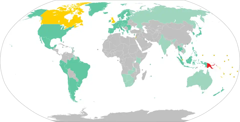 Holders of passports from all Pacific Island States are eligible for Visa on arrival at all authorized ports of entry in Papua New Guinea, specifically Jacksons International Airport and Wutung land border post.[2] The Immigration Department said VOA does not apply to diplomats and civil servants on formal long-term contracts, but only to those visiting on short-term contracts.[2] Visa agreements were signed with India and South Korea for diplomatic and official passport holders. However, they are yet to be ratified.[2]