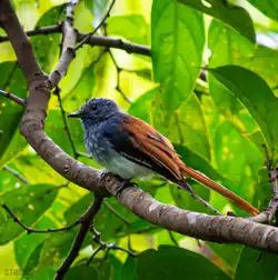 EBird describes the bird as "A medium-sized, long-tailed bird of forest . Dull blue on the head, chest, back, and shoulder, with some paler blue streaking on the chest and crown. Has a white belly and a rufous lower back, outer tail feathers, and wing, with dark central tail feathers and a dark edge to the wing. Often cocks and fans tail while foraging. Similar to Black-naped Monarch, but has rufous rump and tail. Voice is a single, nasal 'jep' note given at intervals or sped up into a rapid series."[2]