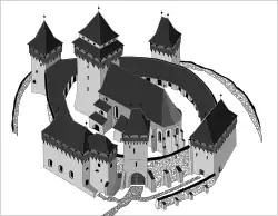 In the 12th century, fortifications began to be built around the chapel. Forming an oval and made of river and field stone, the south, east and northeast walls have survived;[1] these are 7 m in height.[5] The entrance is through the southeast wall, to which two towers and two bastions were added in the 14th century. The south tower, built into the wall exterior, had three floors and a battlement resting on wooden corbels. Sharing a roof with the south bastion, the tower's lower levels were joined into a hall entered from the east. The topmost level kept its parapets, with their oak border and moveable logs that could shut in defenders. The south bastion battlement and roof were joined with those of the south tower.[1]