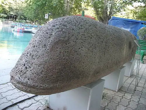 A vishapakar (Armenian: Վիշապաքար) also known as vishap stones, vishap stelae, "serpent-stones", "dragon stones", are characteristic monoliths found in large numbers in the Armenian Highlands, in natural and artificial ponds, and other sources of water. They are commonly carved from one piece of stone, into cigar-like shapes with fish heads or serpents.[1] Supposedly they are images of vishaps, a water dragon of Armenian folklore.[2] There are about 150 known extant vishap stelae, of which 90 are found in Armenia.[3]