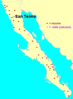 The Visita de San Telmo was a Catholic visita located along the Arroyo de San Telmo in Baja California, Mexico. The visita was founded by Dominican missionaries sometime between 1798 and 1800 as an extension of Misión Santo Domingo de la Frontera.