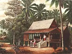 During this period, the art of Singapore was diverse, influenced by travellers, itinerant artists, and migrants from China, the Indian subcontinent, as well as the West, all bringing different pictorial traditions.[1] From the 19th century, European perecptions of Singapore are seen through art that depicted "tropical" motifs like palm trees, kampungs, and studies of locals.[1] These motifs appear in the works of Singapore artists from the 1930s onwards.[1]