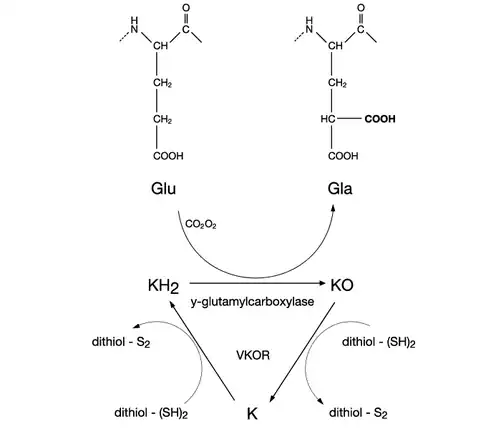 Carboxylation of these vitamin K-dependent Gla-proteins, besides being essential for the function of the protein, is also an important vitamin recovery mechanism since it serves as a recycling pathway to recover vitamin K from its epoxide metabolite (KO) for reuse in carboxylation.