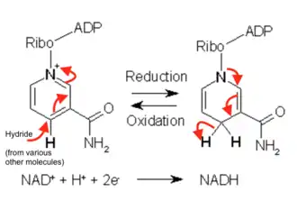 NAD+ acts as an electron carrier that mediates the interconversion of energy between nutrients and the cell's energy currency, adenosine triphosphate (ATP). In oxidation-reduction reactions, the active part of the cofactor is the nicotinamide. In NAD+, the nitrogen in the aromatic nicotinamide ring is covalently bonded to adenine dinucleotide. The formal charge on the nitrogen is stabilized by the shared electrons of the other carbon atoms in the aromatic ring. When a hydride atom is added onto NAD+ to form NADH, the molecule loses its aromaticity, and therefore a good amount of stability. This higher energy product later releases its energy with the release of a hydride, and in the case of the electron transport chain, it assists in forming adenosine triphosphate.[35]