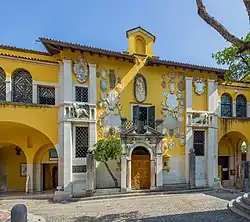 The house, Villa Cargnacco, had belonged to the German art historian of the Italian Renaissance Henry Thode, from whom it was confiscated by the Italian state, including artworks, a collection of books, and a piano which had belonged to Liszt. [2][3] d'Annunzio rented it in February 1921 and within a year reconstruction started under the guidance of architect Giancarlo Maroni. Due to d'Annunzio's popularity and his disagreement with the fascist government on several issues, such as the alliance with Nazi Germany, the fascists did what they could to please d'Annunzio in order to keep him away from political life in Rome. Part of their strategy was to make huge funds available to expand the property, to construct and/or modify buildings, and to create the impressive art and literature collection. In 1924 the airplane that d'Annunzio used for his pamphleteering run over Vienna during World War I was brought to the estate, followed in 1925 by the MAS naval vessel used by him to taunt the Austrians in 1918 in the Beffa di Buccari. In the same year the bow section of the protected cruiser Puglia was hauled up the hill and placed in the woods behind the house, and the property was expanded by acquisition of surrounding lands and buildings.