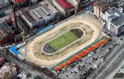 In 2020, the stadium owners announced plans for a two-stage renovation, starting with the removal of administrative buildings. In June 2021, an athletics track was added in addition to football and basketball facilities inside the speedway track.[1] Other improvements included the construction of a new administration building with an amenity complex and motorcycle maintenance area. The speedway track received new lighting and fencing.[1] The second stage increased seating to 7,000 spectators, with a canopy above.[1] While the renovation took place the speedway was held at the Sergei Petrovich Shevchenko Stadium in Ussuriysk.[3]