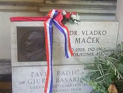 Maček helped found the International Peasants' Union along with Georgi Mihov Dimitrov in 1947. He refused offers for the leadership of the numerous Croatian émigré groups. In 1949, he provided much of the material on Yugoslavia for "Communists Crush Churches in Eastern Europe," edited by Reuben H. Markham,[20] who called him "one of the bravest and most devoted champions of common men and women in southeast Europe."[21] He died of a heart attack in Washington, D.C., on 15 May 1964, at 84. His remains were taken to Croatia in 1996 and buried in the Mirogoj cemetery in Zagreb. He was posthumously awarded the Grand Order of King Dmitar Zvonimir in 2004.[22]