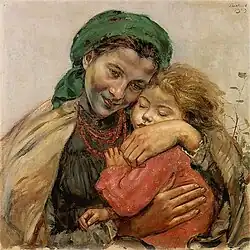 In 1899 he went to study painting at the École nationale supérieure des Beaux-Arts in Paris. In 1902 he had his first showings in an exhibition by the "Sztuka" society. Further exhibitions followed in Munich, Amsterdam, Rome, Berlin, Prague, Vienna, and Warsaw. In 1904 he painted the first of his village (or peasant) "Madonnas".[1] In 1905 he started the cycle of pictures called "Confession" which brought him international recognition. In 1907 he was the first Polish painter to be made a member of the Gallery of the Vienna Secession. When his professor, Jacek Malczewski, was appointed the Rector of the Kraków Academy of Fine Arts in 1912, Hofman obtained a teaching post there. With the outbreak of World War I, in 1914–1920 he lived in Prague and then in Paris, marrying his beloved Ada in 1919.[2] Back in Kraków in 1921, he and his wife lived in a villa on Spadzista Street, later renamed Hofman Street in his honour. Sometime around 1922, influenced by his friendship with Jacek Malczewski, he changed the spelling of his name from Czech to a Polonised 'Wlastimil'. Malczewski died in 1929. Hofman's work was also part of the painting event in the art competition at the 1928 Summer Olympics.[3]