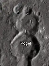 Both the northern and southern ends of Vogel's rim are interrupted by smaller craters. Vogel B to the north is overlain in turn along its northern rim by an even smaller crater, thus forming a cluster of interconnected craters with Vogel being the largest. The rim of Vogel is otherwise relatively intact and not significantly worn.