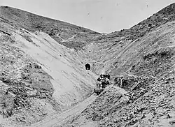 The 1870 Act specified a uniform rail gauge for the country; although the act just specified that the rail gauge was not to exceed 3 ft 6 in (1,067 mm), the Cape gauge as used at that time in Canada and Norway was chosen, as recommended by Charles Fox and Sons of London. Lines were constructed with lightweight track, steep gradients, tight curves and light wooden bridges. The 40 lb/yd (19.8 kg/m) iron rails was later replaced with (now cheaper) 50 lb/yd (24.8 kg/m) steel rails;[17] and then with heavier 55 or 70 lb/yd (27.3 or 34.7 kg/m) rails in the Liberal era of 1891–1912, increasing the maximum axle load from six tonnes (5.9 long tons; 6.6 short tons) to 16 or 18 tonnes (15.7 or 17.7 long tons; 17.6 or 19.8 short tons) with 100 lb/yd (49.6 kg/m) rail. But the tight tunnels with a height limit of 11+1⁄2 ft (3.5 m) led to expensive lowering of track in tunnels or "daylighting" them to accommodate intermodal containers on flat wagons in the 20th century.[16][18][19]