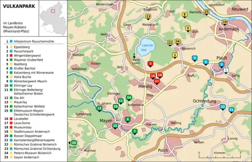 The Volcano Park in Mayen-Koblenz (German: Vulkanpark) is a geopark in the rural district of Mayen-Koblenz in the eastern Vulkan Eifel, Germany. It was founded in 1996 and wraps around the Laacher See (between Brohl-Lützing, Andernach, Plaidt, Mendig and Mayen). Together with the Volcano Park, Brohltal/Laacher See and the Vulkan Eifel Nature and Geo-Park, it forms part of the national Eifel Volcano Land Geo-Park (Geopark Vulkanland Eifel). The three parks are connected by the 280-kilometre-long German Volcano Route.