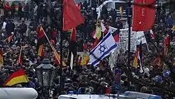 In 2015 the slogan "Wir sind das Volk" became popular again among members of PEGIDA (a nationalist movement), and various groups that claimed to stand in the tradition of Monday Demonstrations. Here, however, the ethnic connotation of "Volk" quickly became obvious. While the slogan "Wir sind ein Volk" was no longer in use since the reunification, the slogan "Wir sind das Volk" was given a new meaning. Now the word "Wir" was used by right wing protesters to refer to themselves, in order to distinguish from migrants and so-called "Gutmenschen", Germans that supported refugees. After Chancellor Angela Merkel decided to give shelter to a growing number of refugees, especially from Syria, in 2015, right wing groups as well as more modest movements, that were referred to by the media as "the concerned citizens", started to use the slogan. They wanted to indicate that, according to their beliefs, the Volk (meaning only ethnic Germans) should have more rights than immigrants and especially refugees. The similarity to the National Socialist Volk conception was pointed out by various media.[6] The protesters also made references to the protests against the dictatorship of the GDR, since they regarded it as their right to decide whether the state should give shelter to refugees or not. This, however, is a constitutional right in Germany for "[p]ersons persecuted on political grounds" that can not be changed unless the constitution is changed with a two-thirds majority in both houses of the parliament; however, asylum seekers who enter "from a member state of the European Communities" already have no constitutional right to asylum.[7]