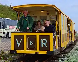 | 8 (2nd) | Southend Pier 40 seat open | Falcon Works, Loughborough | 1898 (Into VER service 1950) | Two 140 Volt motors. | No longer on the railway[12] | Purchased from Southend Pier Railway around 1948. Operated on VER until the 1990s when it was decided to retire the aged Southend cars. Static display at Southend Pier Museum. | |