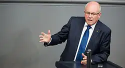 Volker Kauder (born 3 September 1949) is a German lawyer and politician of the Christian Democratic Union (CDU). He served as parliamentary group leader of the ruling CDU/CSU faction in the German Bundestag from 2005 to 2018,[1] during which he was frequently referred to as the "right hand" of Chancellor Angela Merkel.[2]