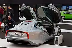 The Volkswagen XL1 (VW 1-litre) is a two-person limited production diesel-powered plug-in hybrid produced by Volkswagen. The XL1 car was designed to be able to travel 100 km on 1 litre of diesel (280 mpg‑imp; 240 mpg‑US), with a fully charged battery, while being both roadworthy and practical.[4] Without using electric, the XL can travel 100 km on 2 litres of diesel.[5] To achieve such economy, it was produced with lightweight materials, a streamlined body and an engine and transmission designed and tuned for economy. The concept car was modified first in 2009 as the L1[6] and again in 2011 as the XL1.[7]