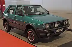 In 1989, the Rallye Golf appeared as a rallye "homologation special" for Group A rallying. Distinguishable by its box-flared wheel arches and rectangular projector headlamps, this model featured Syncro four-wheel drive, a cable shifted transmission and a G-supercharger 1763 cc, marginally less than the standard 1781 cc to enable the car to enter in the sub 3-litre class for Group A rallying.