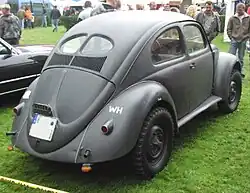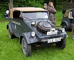 The Volkswagen Type 82 Kübelwagen (ⓘ), or simply Kübel,[2] contractions of the original German word Kübelsitzwagen (translated: 'bucket-seat car' — but when the contractions are translated literally a back-formation of 'bucket' or 'tub'-car results),[3] is a military light utility vehicle designed by Ferdinand Porsche and built by Volkswagen during World War II for use by the Nazi German military (both Wehrmacht and Waffen-SS). Based heavily on the Volkswagen Beetle, it was prototyped and first deployed in Poland as the Type 62, but following improvements entered full-scale production as the Type 82. Several derivative models, such as the Kommandeurswagen, were also built in hundreds, or in dozens.