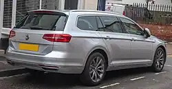 The Volkswagen Passat (B8) is a mid-size car / large family car (D-segment) manufactured by Volkswagen from 2014 to 2023, replacing the Passat B6/B7 models. It is available in a 4-door saloon and a 5-door estate sold as "Variant" in some markets. It was first introduced at the Volkswagen Design Center Potsdam on 3 July 2014.[2] The B8 is the eighth-generation model in the Volkswagen Passat series and the first passenger vehicle of Volkswagen Group to be based on an enlarged version of the MQB platform.[3]