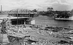 The Volodarsky Bridge (Russian: Волода́рский мост) is a moveable bridge across the Neva River in Saint Petersburg, Russia. The bridge connects Narodnaya and Ivanovskaya streets (Nevsky district).[1] It is named after V. Volodarsky, a revolutionary, who was killed near the future bridge in 1918. It is the only bridge in the city with an overpass for trams (left bank). The bridge is part of the Central Arc Thoroughfare. In 1932-1936, according to engineer G.P. Peredery's project, a three-span reinforced concrete arch bridge with a metal double-winged drawbridge was built. In 1986-1993, the old bridge was dismantled and replaced with a metal girder. The bridge length is 332 meters, the width is 24–27 meters. Upstream is the Bolshoy Obukhovsky Bridge, and below is the Finland Railway Bridge.