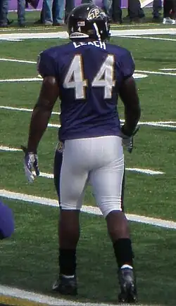 Leach signed a three-year, $11 million contract with the Baltimore Ravens on July 31, 2011, making him the highest paid fullback in the NFL.[19] While paving the way for Ray Rice, Leach also amassed 12 carries for 35 yards, plus 15 receptions for 69 yards.[20] This performance earned him another first team All-Pro nomination and Pro Bowl appearance in 2011.[21][22] He was ranked 45th by his fellow players on the NFL Top 100 Players of 2012.[23]