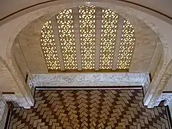 The main entrance of the building leads into the domed Hall of Heroes. This massive space, flanked by four huge arched windows made from yellow Belgian glass, contains the unique marble Historical Frieze which is an intrinsic part of the design of the monument. It is the biggest marble frieze in the world.[4] The frieze consists of 27 bas-relief panels depicting the history of the Great Trek, but incorporating references to everyday life, work methods and religious beliefs of the Voortrekkers. The set of panels illustrates key historical scenes starting from the first voortrekkers of 1835, up to the signing of the Sand River Convention in 1852. In the centre of the floor of the Hall of Heroes is a large circular opening through which the Cenotaph in the Cenotaph Hall can be viewed.