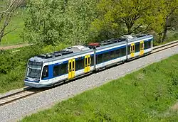 The Stadler Citylink (known as the Vossloh Citylink until 2015) is a series of tram-trains manufactured by Stadler Rail at its Valencia factory since 2011. The design was introduced by Vossloh España before their takeover by Stadler Rail in 2015. They are currently used in Germany, Hungary, Mexico, Spain and the United Kingdom, with more on order in Austria. Stadler opened a new factory in the United States in 2016, which is in the process of building up to 80 Citylink vehicles for service in Salt Lake City beginning in 2028.[1]