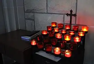 A votive candle or prayer candle is a small candle, typically white or beeswax yellow, intended to be burnt as a votive offering in an act of Christian prayer, especially within the Anglican, Lutheran, and Roman Catholic Christian denominations, among others.[1][2][3][4] In Christianity, votive candles are commonplace in many churches, as well as home altars, and symbolize the "prayers the worshipper is offering for him or herself, or for other people."[5][3][4] The size of a votive candle is often two inches tall by one and a half inches diameter, although other votive candles can be significantly taller and wider. In other religions, such as Hinduism and Buddhism, similar offerings exist, which include diyas and butter lamps.