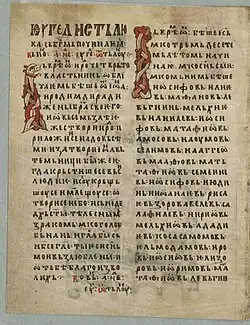 Vukan's Gospel (Serbian: Вуканово јеванђеље, romanizedVukanovo jevanđelje) is a 13th-century illuminated manuscript (Gospel Book), written in Serbian recension of Church Slavonic language and the Cyrillic script. It is one of the oldest preserved Serbian medieval books, with more than 189 pages.[1][2][3][4][5]