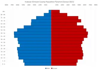 According to the 2001 census, Croats with 160,227 individuals constitute 78.27% of the county's entire population. Ethnic Serbs are the largest ethnic minority making 15.45% or 31,644 individuals. Other ethnic groups are Hungarians 2,047 (1%), Rusyns 1,796 (0.88%), Slovaks 1,338 (0.65%), Bosniaks 1,138 (0.54%).[6] The largest Hungarian community is in Tordinci (18% of total population in the municipality), for Rusyns is Bogdanovci (23%), and for Bosniaks is Gunja (34%); while 78% of total Slovak population in the county live in Ilok.