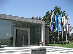 In 2006, the Ovčara Memorial Centre, designed by Miljenko Romić, opened at the site of the former Ovčara farm.[90] The centre opened in a remodeled storage building where prisoners were held on 20 November 1991 before they were executed. The dim interior of the building, accessed through a glass-encased foyer, features illuminated photographs of 200 victims exhumed from the mass grave and the 61 missing who were executed at Ovčara. The concrete floor contains encased spent cartridges and the Spiral of Evil (Serbo-Croatian: Spirala zla) sculpture displaying the names of 261 victims. The ceiling contains 261 lighting fixtures symbolising the number of victims. The centre also contains an exhibition of personal belongings and documents found in the mass grave. The completion of the centre was funded by the City of Zagreb at the cost of 2 million kuna (c. 270,000 euro).[91] By July 2014, the centre was visited by about 500,000 people.[92] In the same year, Croatia launched an education programme which entails visits to the centre by eighth-grade pupils, and 50,000 pupils are scheduled to visit the centre annually.[93] In 2010, Serbian President Boris Tadić visited the memorial centre and the mass grave site, as the first Serbian head of state to do so. He laid wreaths at the site and apologized on behalf of the Serbian state.[94]
