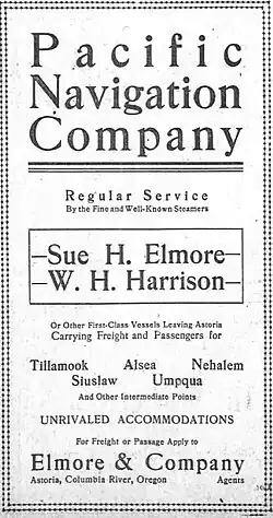The coast route also included service to Portland, Oregon, either by connecting river steamer or Harrison itself. As of January 1895, under Captain P. Schrader, Harrison was running for the Oregon Coast Transportation Company, and scheduled to depart from Portland to Tillamook and Nehalem, receiving freight at Portland's Couch Street wharf on the Willamette River until 5 p.m. on Monday, January 14, 1895.[13] Mark L. Cohn & Co., of 146 Front Street, were the agents for Harrison.[13] On Wednesday, May 10, 1899, weather permitting, Harrison was scheduled to sail for Tillamook, Garibaldi, Bay City, and Hobsonville, running in conjunction with the Columbia river sternwheeler R.R. Thompson, which at that time was employed in carrying passenger and cargo to Astoria from points on the lower Columbia River.[14][15]