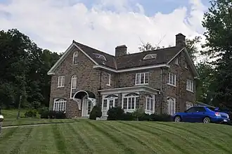 The exterior is 4+1⁄2-inch stone veneer quarried in Philadelphia and applied with a special mortise technique. The circular drive arrives at a matching stone portico with a tongue and groove ceiling and Spanish tile porch. The roof is tile with a hip and valley on the wing side and a hip roof on the rectangular side. There are half-moon windows emerging from the tiled roof that provide side lighting to the upstairs rooms.[2]