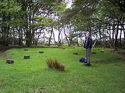 One of his early independent excavations was carried out between 1933 and 1935 at the Bronze Age Bleasdale Circle, near Bleasdale, Lancashire,[17][18] now considered to be an urnfield with a mound ringed by oak posts and enclosed in a palisade.[19] Bleasdale was then the only known timber circle where any of the wood had survived.[17][nb 3] An earlier partial investigation of the site had been carried out in 1898–1900,[17][18][21][nb 4] but Varley was the first to investigate the outer palisade and the larger area it enclosed.[22] He classified the site as a palisade-barrow, similar to the Dutch examples at Calais Wold and Langedijk, but stressed its unique layout.[23] At the time of his excavation, the site was partially reconstructed using concrete posts, and four surviving oak posts were moved to Harris Museum, Preston, which still has a permanent exhibit on the site and the two excavations.[22][24]