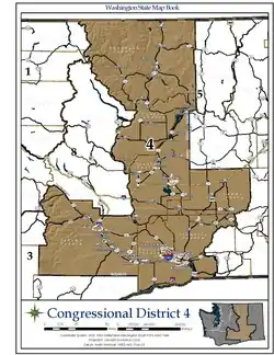 Washington's 4th congressional district encompasses a large area of central Washington, covering the counties of Douglas, Okanogan, Grant, Yakima, Benton, and Klickitat; and parts of Adams and Franklin counties. The district is dominated by the Yakima and Tri-Cities areas. With a Cook Partisan Voting Index rating of R+10, it is the most Republican district in Washington.[2]