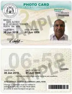 The Western Australia Photo Card is a voluntary photo identification card available to people over 16 and are residents of Western Australia. Up to two cards can be issued - one with and one without an address.[1] It is used to prove identity primarily for those without a drivers licence.